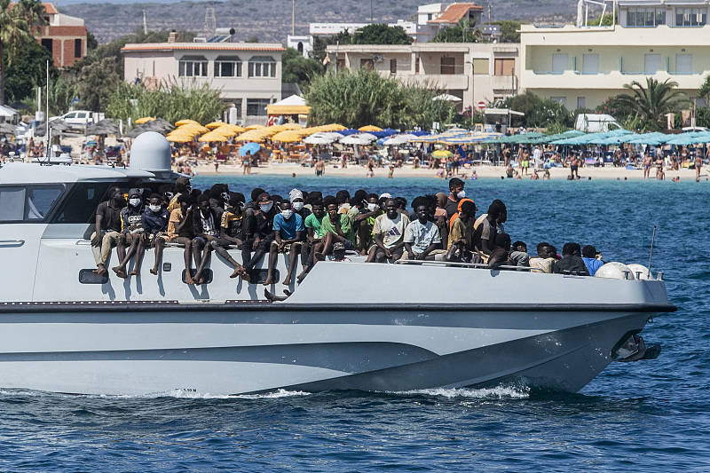 △当地时间9月15日,移民乘船抵达兰佩杜萨岛港口