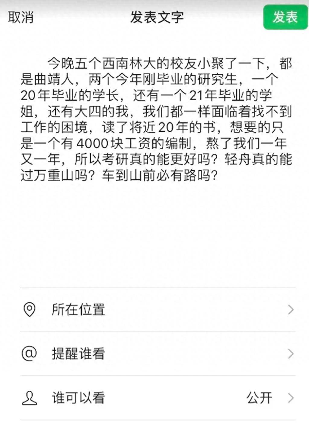 近日,户籍地为云南省曲靖市的大学生吐槽面临找不到工作的困境。想要的仅是4000元的月薪和编制,没想到考编之路,难于上青天。不仅其本人难以找到合适的工作,连他的朋友也骑虎难下,面临困境,即便研究生毕业,也难以找到称心如意的工作,发人深省,引人深思。