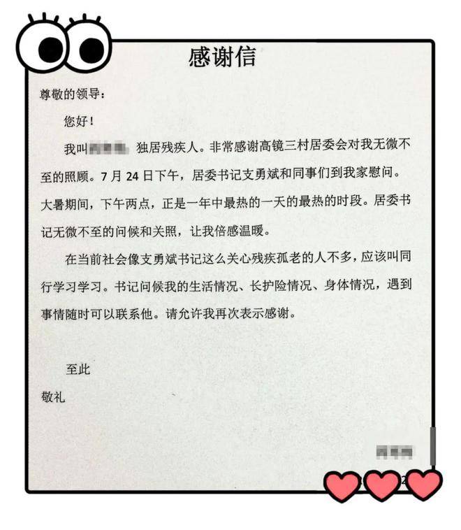 近日,一封来自宝山区高境镇高境三村居民区的残疾独居老人的感谢信送到了高境三村居委会工作人员的手中,信中字字情真意切,深深地表达了社区老年人对居委工作人员的感谢之情。