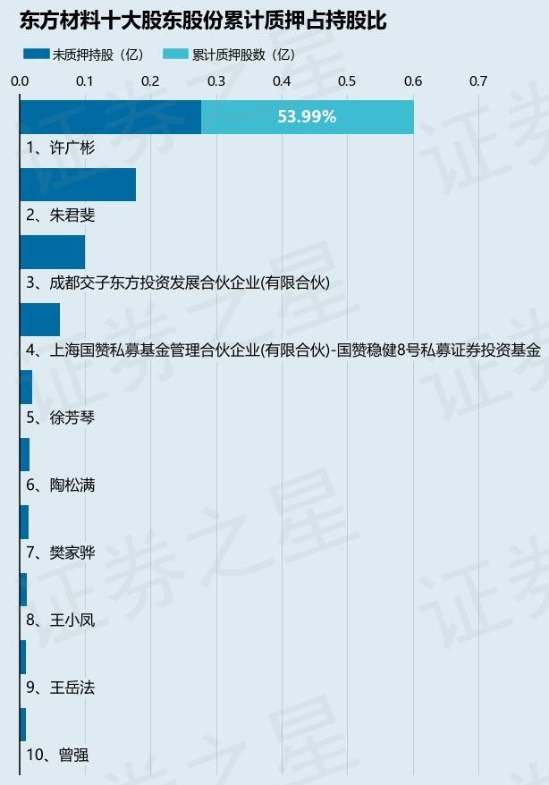 截止本公告日,股东许广彬已累计质押股份3248.25万股,占其持股总数的53.99%。本次质押后东方材料十大股东的累计质押股份占持股比例见下图: