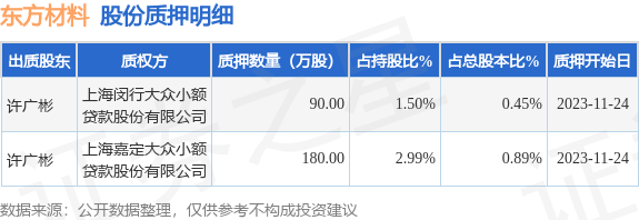 证券之星消息,东方材料(603110)11月29日公开信息显示,股东许广彬向上海闵行大众小额贷款股份有限公司、上海嘉定大众小额贷款股份有限公司合计质押270.0万股,占总股本1.34%。质押详情见下表: