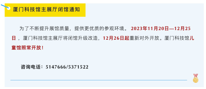 2023年11月20日—12月25日 ,厦门科技馆主展厅将闭馆升级改造,12月26日起重新对外开放。