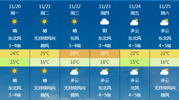 气象部门预测:今起三天,我市将维持晴好天气。冷空气影响下,今天我市以晴到少云天气为主,白天城区最高气温22℃左右,夜晨最低气温依然13℃上下,昼夜温差较大。
