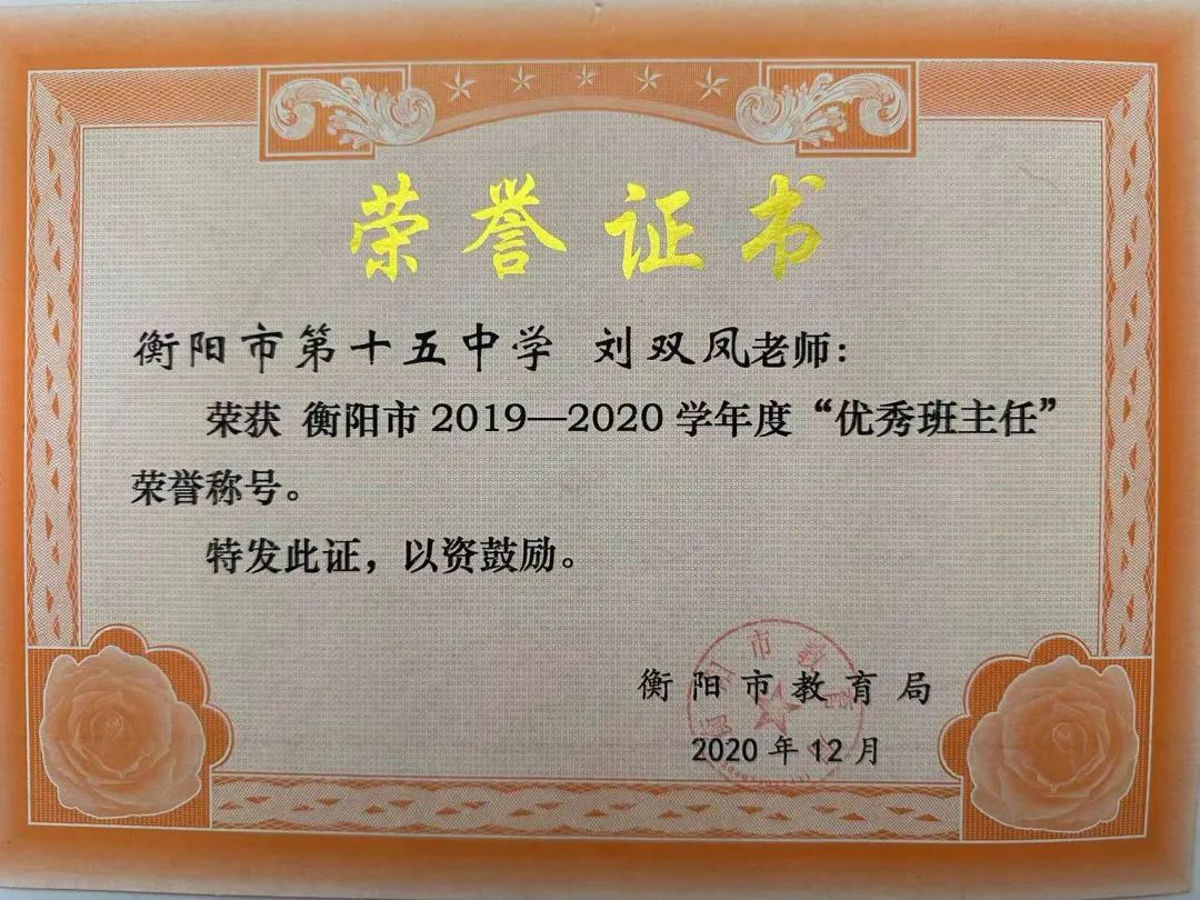 自1998年8月大学毕业分配到衡阳市十五中学以来,刘老师一直担任两个班的语文教学工作,工作二十五年中,绝大部分时间都担任班主任工作。从教以來,她坚持以饱满的教学热情、扎实的工作作风和吃苦耐劳的优良品质,牢记教师职责使命,在本职岗位上,勤于学习,努力工作,教育成绩得到了各级领导及广大学生和家长的一致好评。