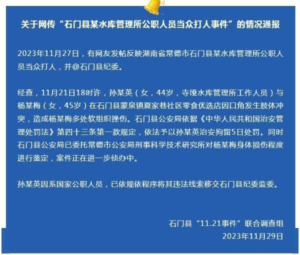 2023年11月27日,有网友发帖反映湖南省常德市石门县某水库管理所公职人员当众打人,并@石门县纪委。