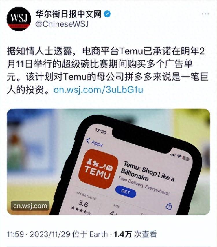 11月29日,在财报发布次日,华尔街日报中文网透露出,Temu将继续登陆明年2月11日的超级碗,而Temu被美国消费者所熟知也正是源于上一届美国春晚。