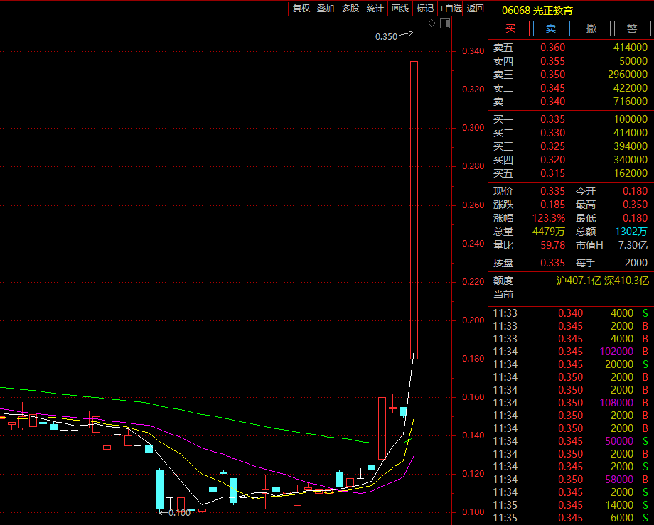 港股市场教育概念股早盘异动,光正教育大幅高开20%后继续放量飙升,盘中一度涨逾130%,开盘仅1小时成交就较昨日全天增加逾20倍,在本周一时,光正教育也曾大涨31.15%,本周以来累计暴涨187%;思考乐教育也高开高走,一度涨逾26%,本周累计大涨近50%,成实外教育、枫叶教育等纷纷跟涨。