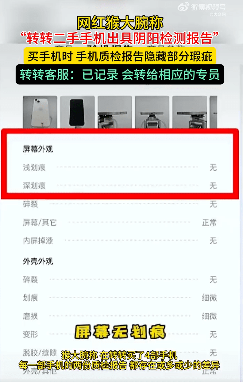 对此,“转转二手”发布声明向博主猴大腕道歉并第一时间组织了排查,“转转二手”称经过调查,在回收检测中,确实存在“屏幕轻微划痕”和“摄像头拍照有斑”的情况,并导致了回收价格的降低。
