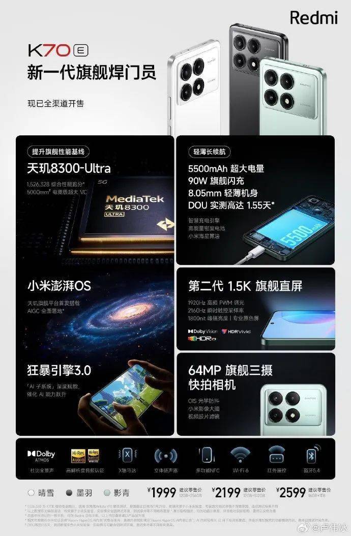 @快科技:Redmi K70系列正式发布,带来K70E、K70、K70 Pro三款机型,起售价分别为1999元、2499元、3299元。