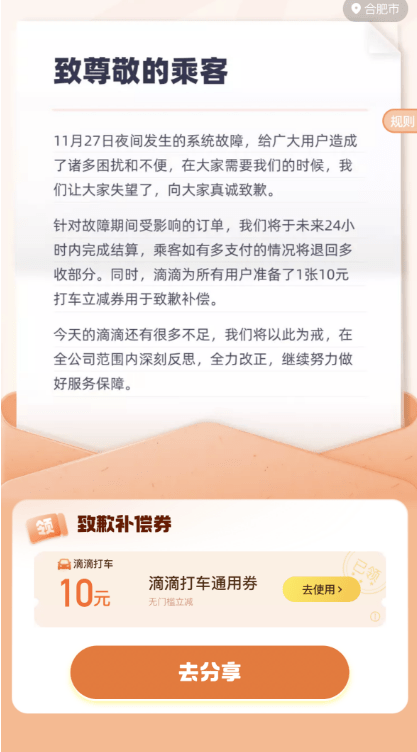 滴滴向所有用户补偿10元打车券 ,部分网友反映小程序被挤爆滴滴致歉补偿券领不了。