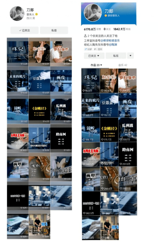 当下,刀郎的视频号粉丝不及某音平台,作品数据有明显差距