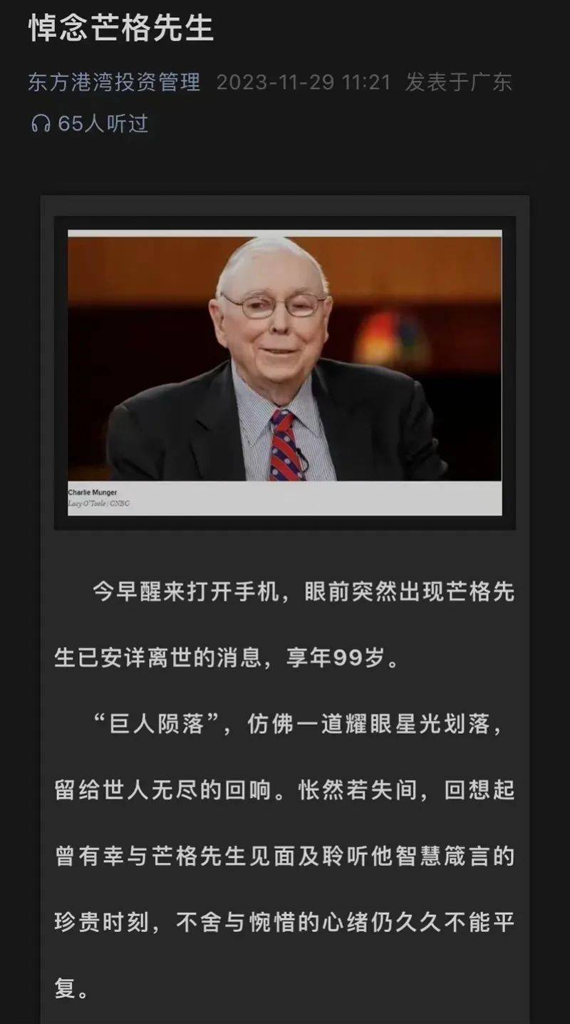 “巨人陨落。”国内价值投资的知名大佬但斌发文悼念芒格。他提到,“芒格先生智趣幽默的回答,对投资的深刻理解与洞见,处处透露着世人难以企及的智慧与洞察力,给我们留下了非常深刻的印象。”