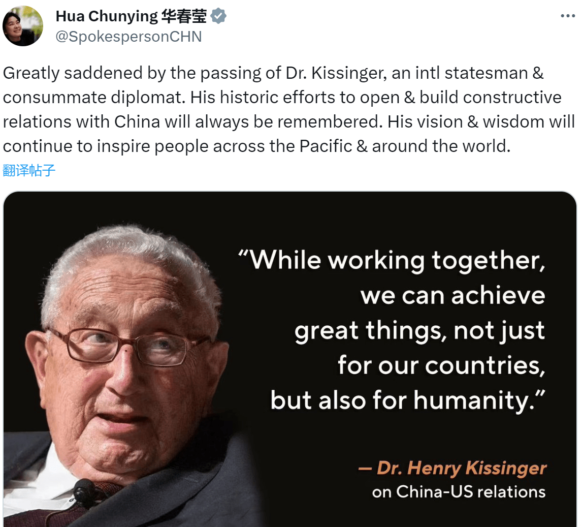 华春莹补充称,“他为开拓并建设(美国)与中国建设性关系所做的历史性贡献将被永远铭记。他的远见和智慧将继续激励太平洋两岸和全世界的人们”。华春莹还引用了基辛格在谈论中美关系时的一句话:“通过共同努力,我们可以取得伟大成就,不仅是为了我们两国,还为了全人类。”