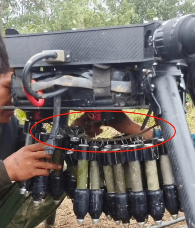 果敢同盟军使用的无人机,实际上就是国内常见的农药无人机,但他们对其进行了改装,将几十枚枪榴弹用一根绳子挂在无人机下方,然后一次性投放,对缅军进行“地毯式轰炸”。
