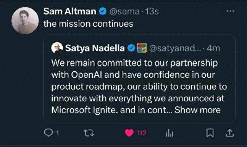 随后Sam Altman转发该帖并表示:“任务继续。”