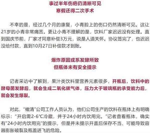“橄清”瓶爆裂扎伤脸,缝了8针