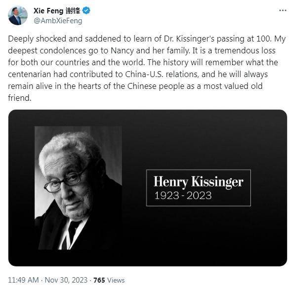谢锋写道,“得知基辛格博士去世,享年100岁,我深感震惊和悲痛。我向南希(基辛格夫人)以及她的家人致以最深切的哀悼。这对我们(中美)两国和世界来说都是巨大的损失。历史将铭记这位百岁老人为中美关系作出的贡献,他将作为最珍贵的老朋友,永远活在中国人民心中。”