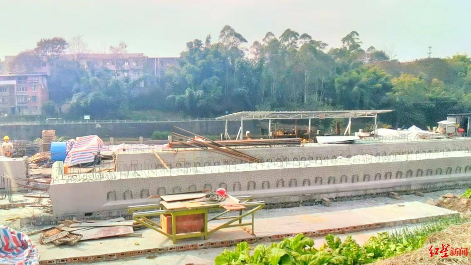 近日,红星新闻记者来到王村老桥旧址,看到桥两头仍然残存着部分老桥基础,两岸已经打围施工,工地上摆放着一些已经浇筑好的混凝土梁板,几名工人正在绑扎桥墩的钢筋,多辆运输渣土的货车来回穿梭。