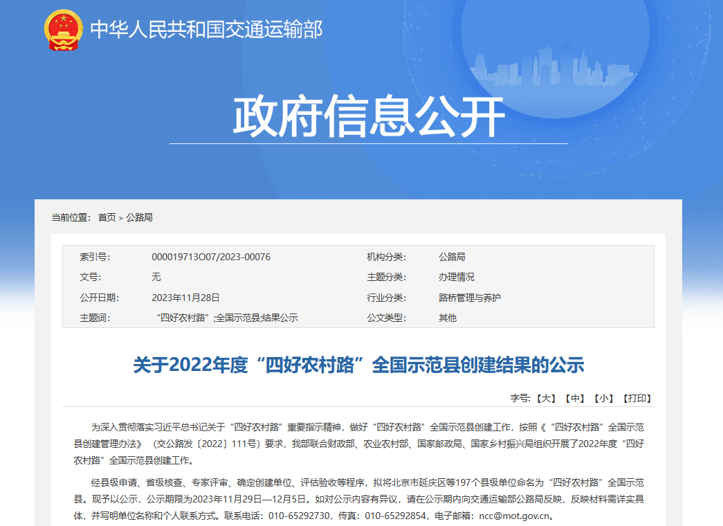 经县级申请、省级核查、专家评审、确定创建单位、评估验收等程序,拟将北京市延庆区等197个县级单位命名为“四好农村路”全国示范县。现予以公示,公示期限为2023年11月29日—12月5日。如对公示内容有异议,请在公示期内向交通运输部公路局反映,反映材料需详实具体,并写明单位名称和个人联系方式。联系电话:010-65292730,传真:010-65292854,电子邮箱:ncc@mot.gov.cn。