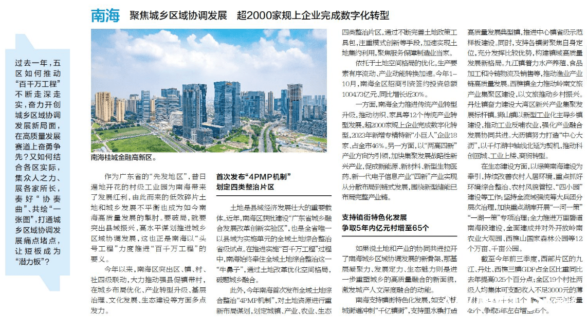作为广东省的“先发地区”,昔日遍地开花的村级工业园为南海带来了发展红利,由此而来的低效碎片土地和城乡发展不平衡也成为如今南海高质量发展的掣肘。要破局,就要突出县域振兴,高水平谋划推进城乡区域协调发展,这也正是南海以“头号工程”力度推进“百千万工程”的要义。