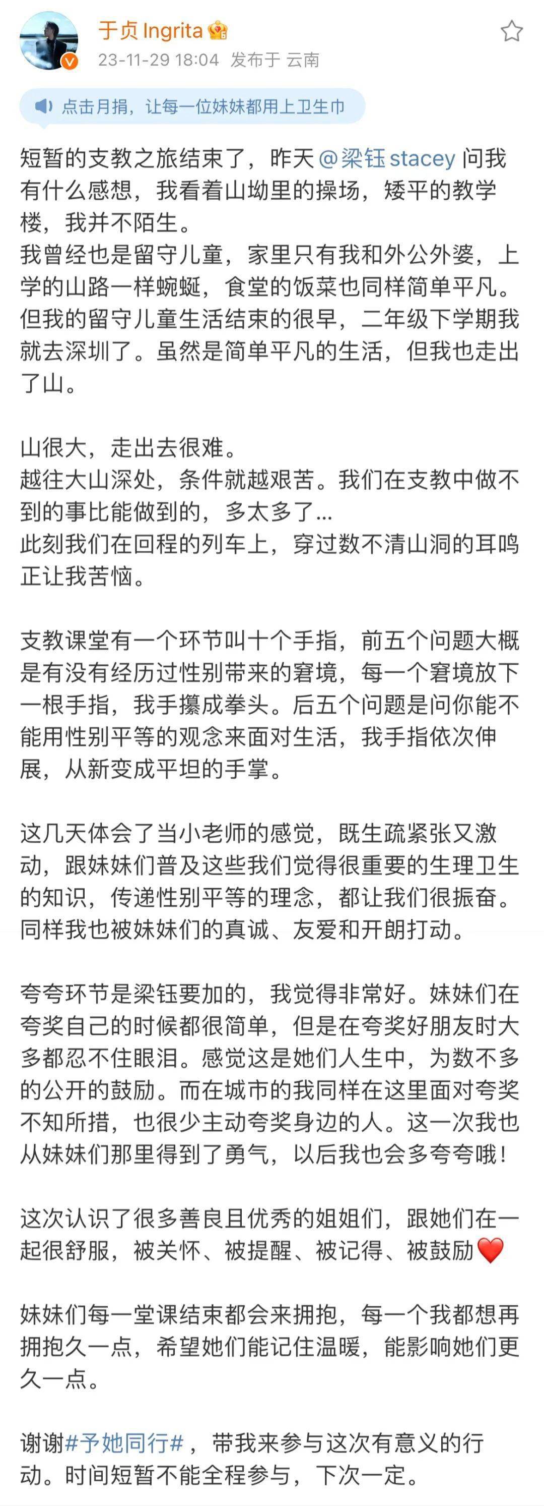 于贞最近前往云南山区支教,为山区的女孩科普生理知识,为她们传递知识与爱。