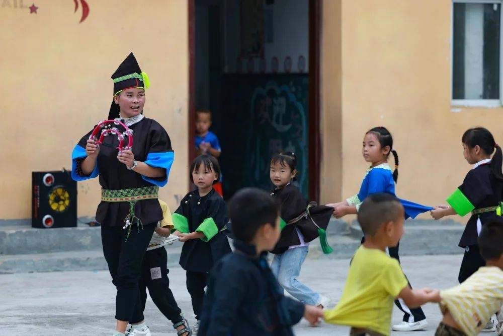 9月7日,在贵州省榕江县两汪乡,柳吉小学教师王章艳带领学生在课间玩游戏。图/新华社 刘续