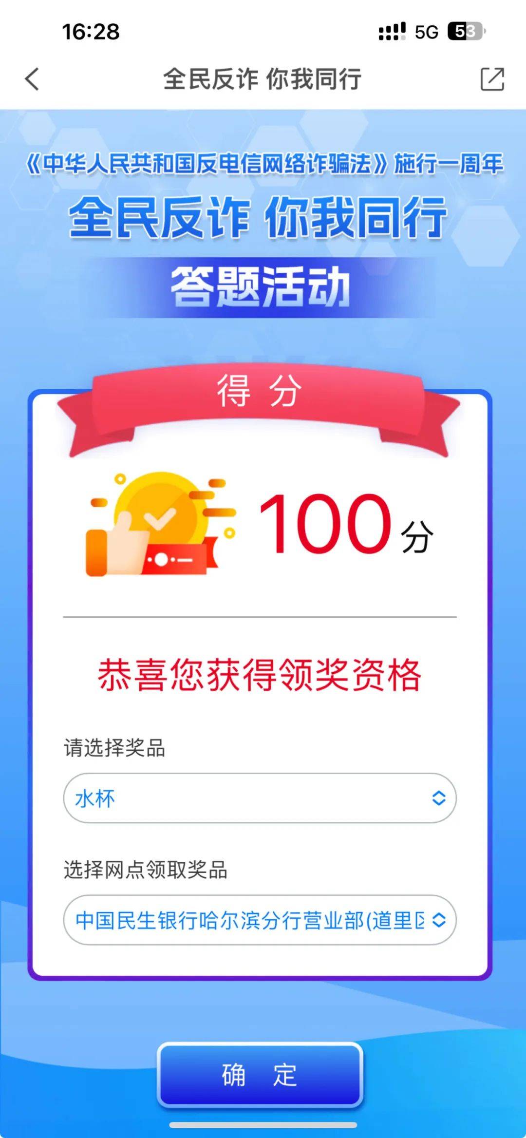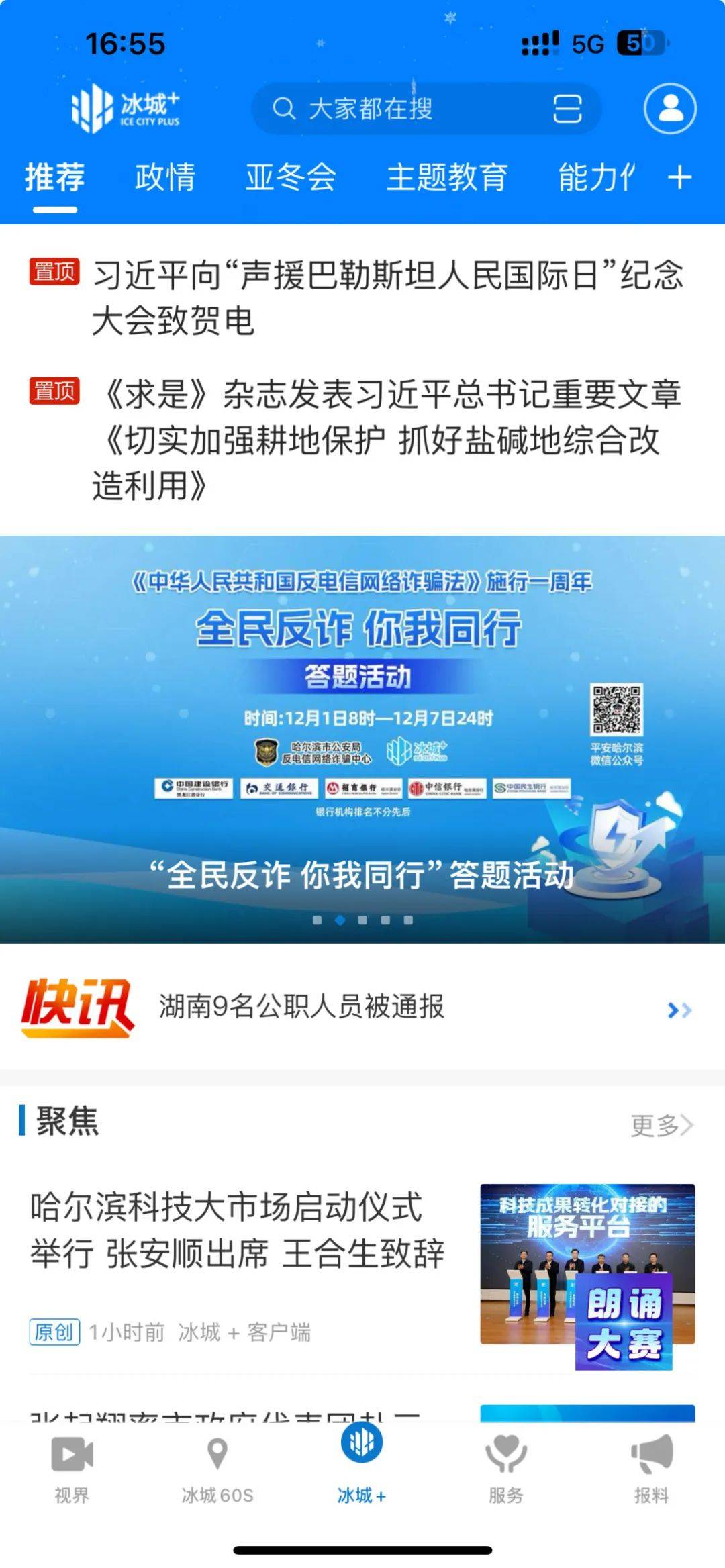 12月1日,《中华人民共和国反电信网络诈骗法》施行一周年之际,哈尔滨市公安局联合哈尔滨日报社,在“冰城+”客户端推出“全民反诈 你我同行”有奖答题活动,协办方建设银行、交通银行、招商银行、中信银行、中国民生银行准备了数千份礼品,快来扫码答题拿奖品吧!