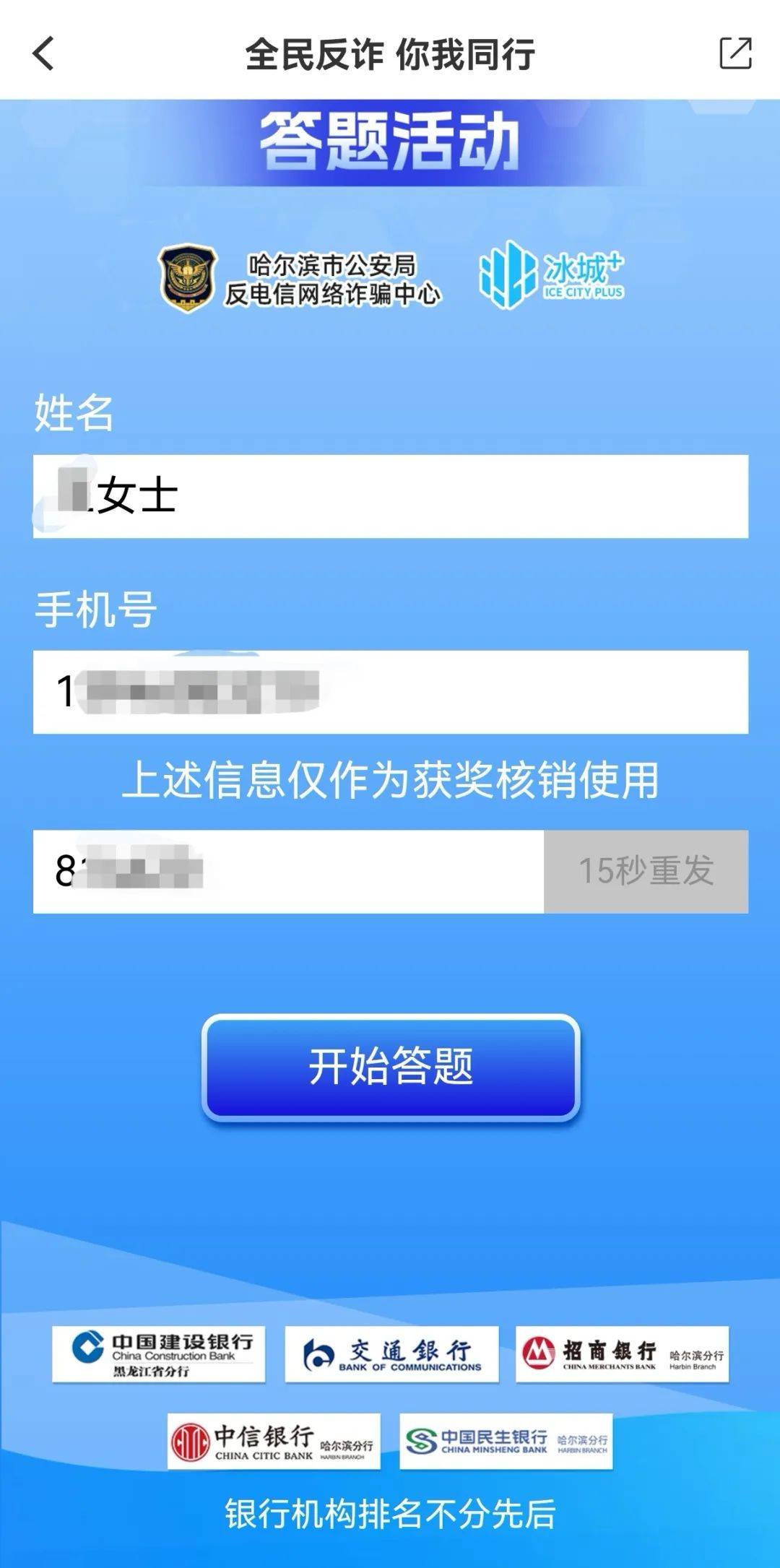 输入姓名、手机号(不收集个人信息,仅作为领奖身份识别凭证)开始答题。
