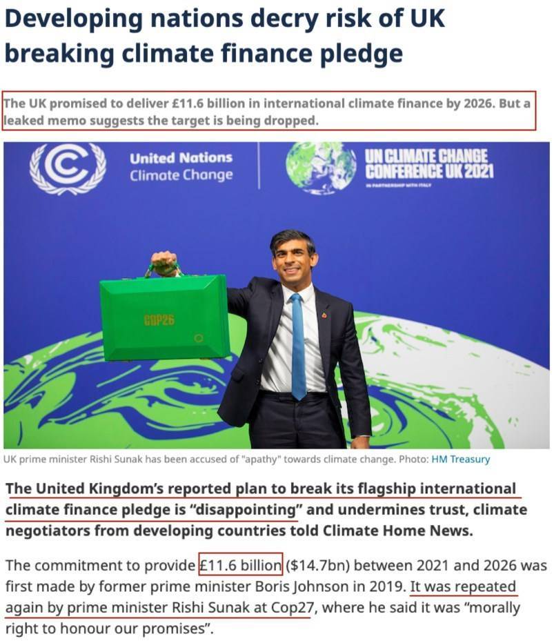 在此情况下,“(英国)背弃承诺是不幸和可悲的,特别是对那些首当其冲受到气候危机影响的发展中国家而言”。