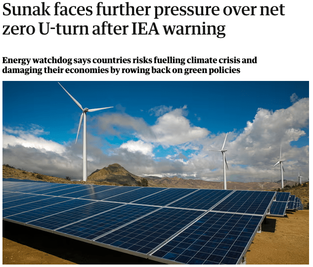 △英国《卫报》网站:国际能源署警告说,英国在绿色政策上的倒退可能会加剧气候危机,损害本国经济。