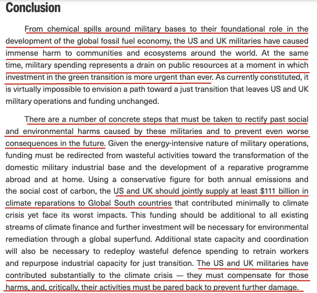 “美国和英国的军队都对气候危机负有重大责任,必须对此做出补偿。更重要的是,它们的军事活动必须减少,以防止进一步的破坏。”