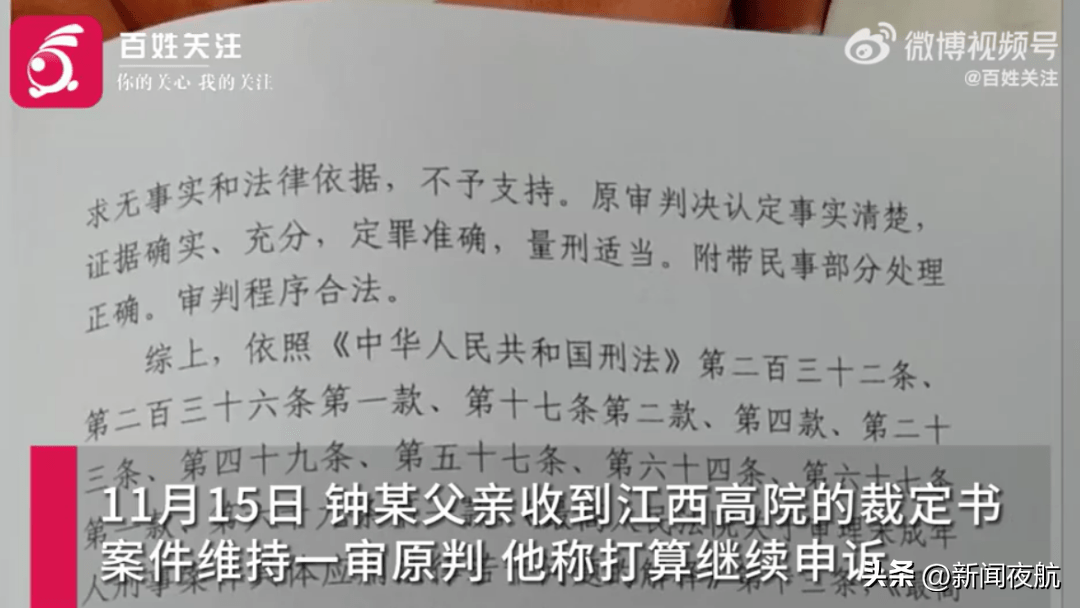 钟某家属提出抗诉和上诉,二审后江西高院做出维持原判的裁定。钟某父亲称打算继续申诉。