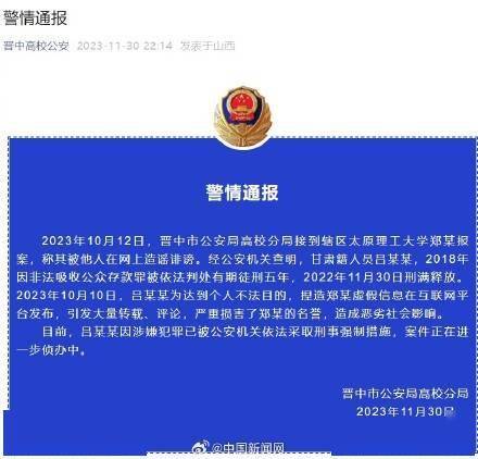 晋中市公安局高校分局30日通报:2023年10月12日,晋中市公安局高校分局接到辖区太原理工大学郑某报案,称其被他人在网上造谣诽谤。经公安机关查明,甘肃籍人员吕某某,2018年因非法吸收公众存款罪被依法判处有期徒刑五年,2022年11月30日刑满释放。2023年10月10日,吕某某为达到个人不法目的,捏造郑某虚假信息在互联网平台发布,引发大量转载、评论,严重损害了郑某的名誉,造成恶劣社会影响。目前,吕某某因涉嫌犯罪已被公安机关依法采取刑事强制措施,案件正在进一步侦办中。