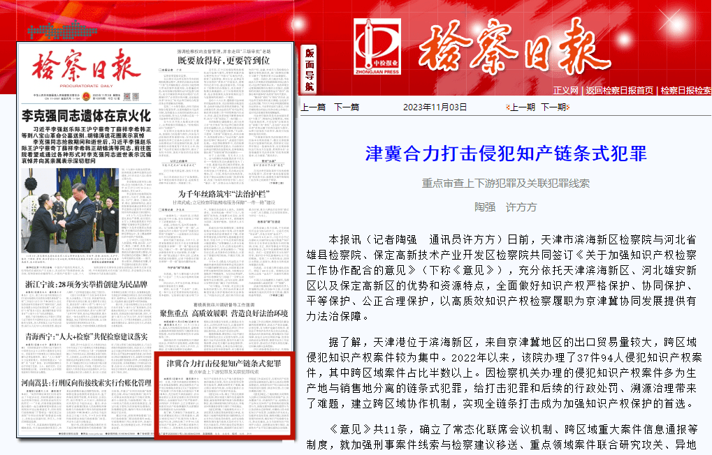 近日,《检察日报》头版以《津冀合力打击侵犯知产链条式犯罪 重点审查上下游犯罪及关联犯罪线索》为题,对天津市滨海新区检察院与河北省雄县检察院、保定市高新技术产业开发区检察院共同签订《关于加强知识产权检察工作协作配合的意见》,以高质效知识产权检察履职为京津冀协同发展提供有力法治保障进行了宣传报道。