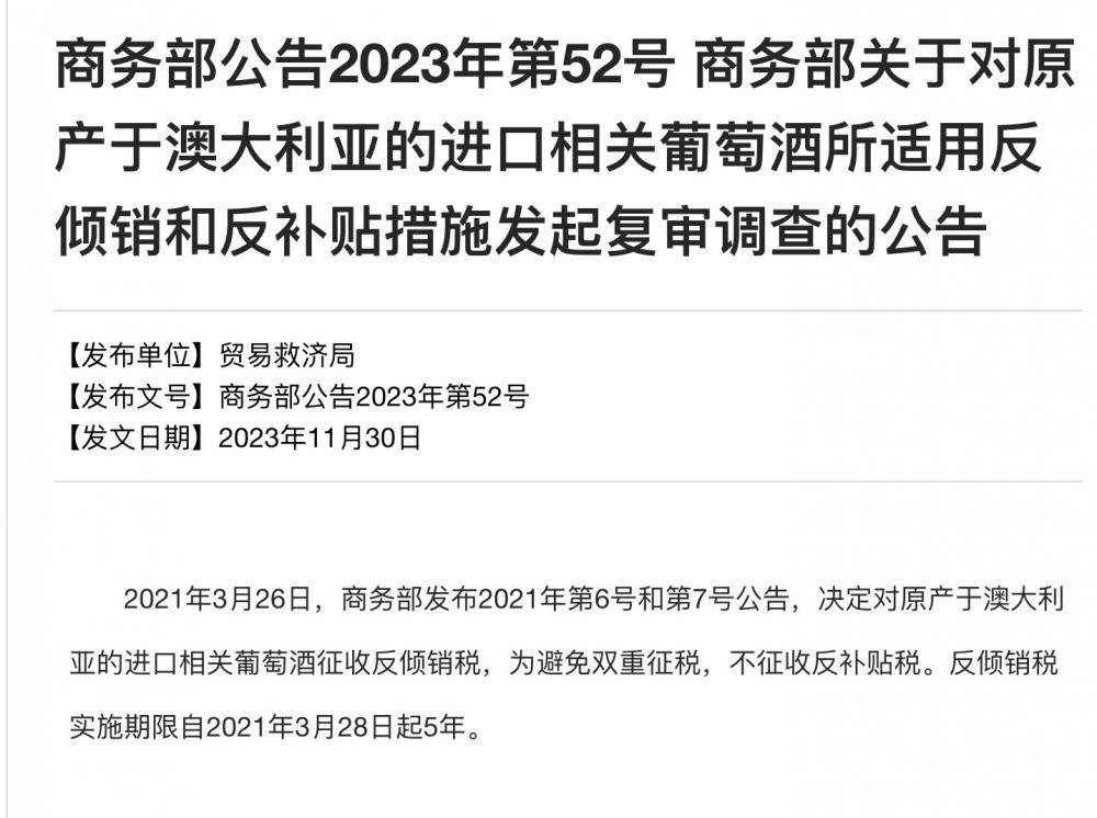 11月30日下午,商务部官网贴出公告,决定即日起对原产于澳大利亚的进口相关葡萄酒所适用反倾销措施和反补贴措施进行复审。