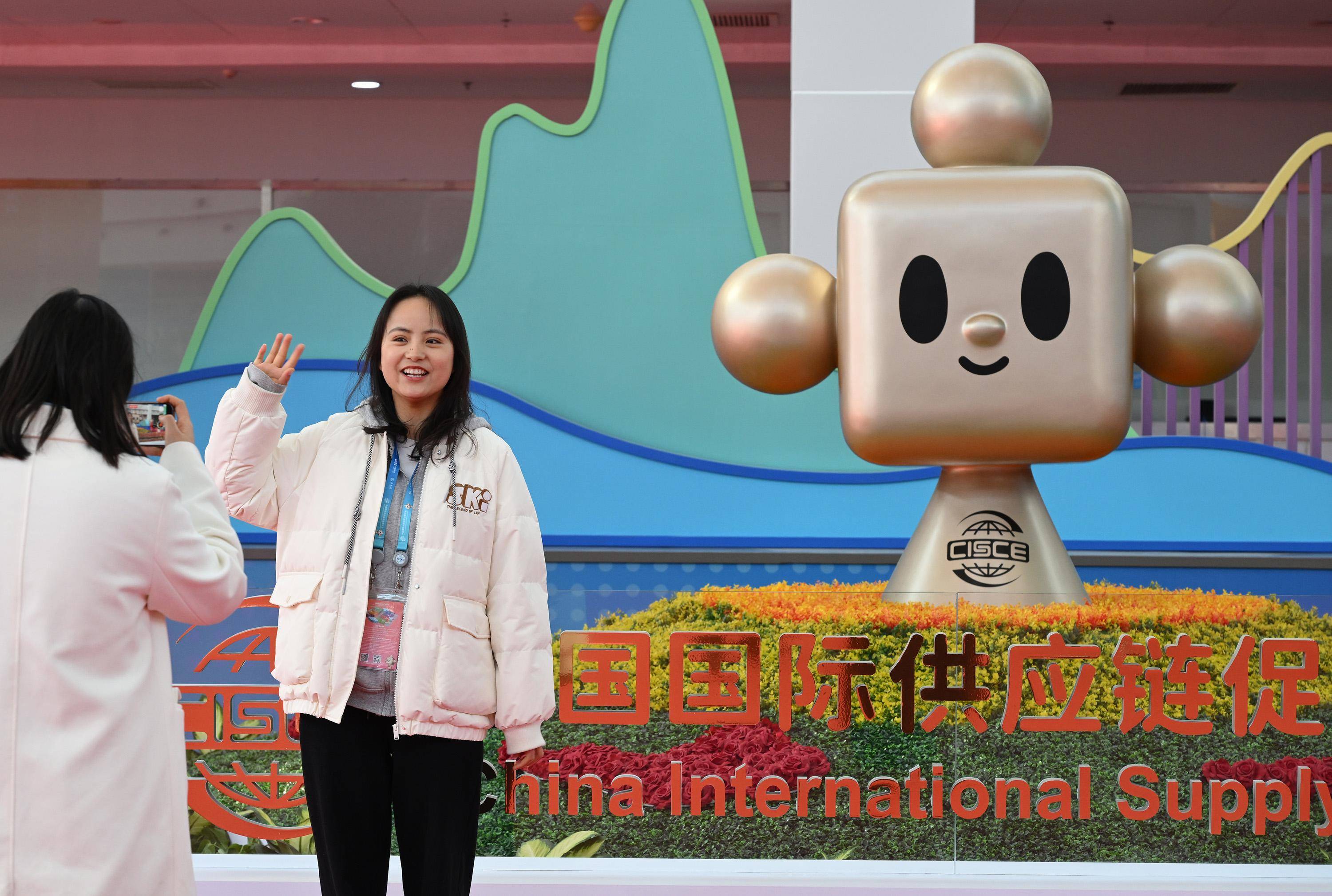 “链氪”是首届中国国际供应链促进博览会(以下简称链博会)的吉祥物。在首届链博会上随处可见带有“链氪”元素的路牌、花坛和各种导引系统等。同时“链氪”元素的文创品广受欢迎,不少参观者选择带着“链氪”文创产品逛展区,成为会场上的“新时尚”。