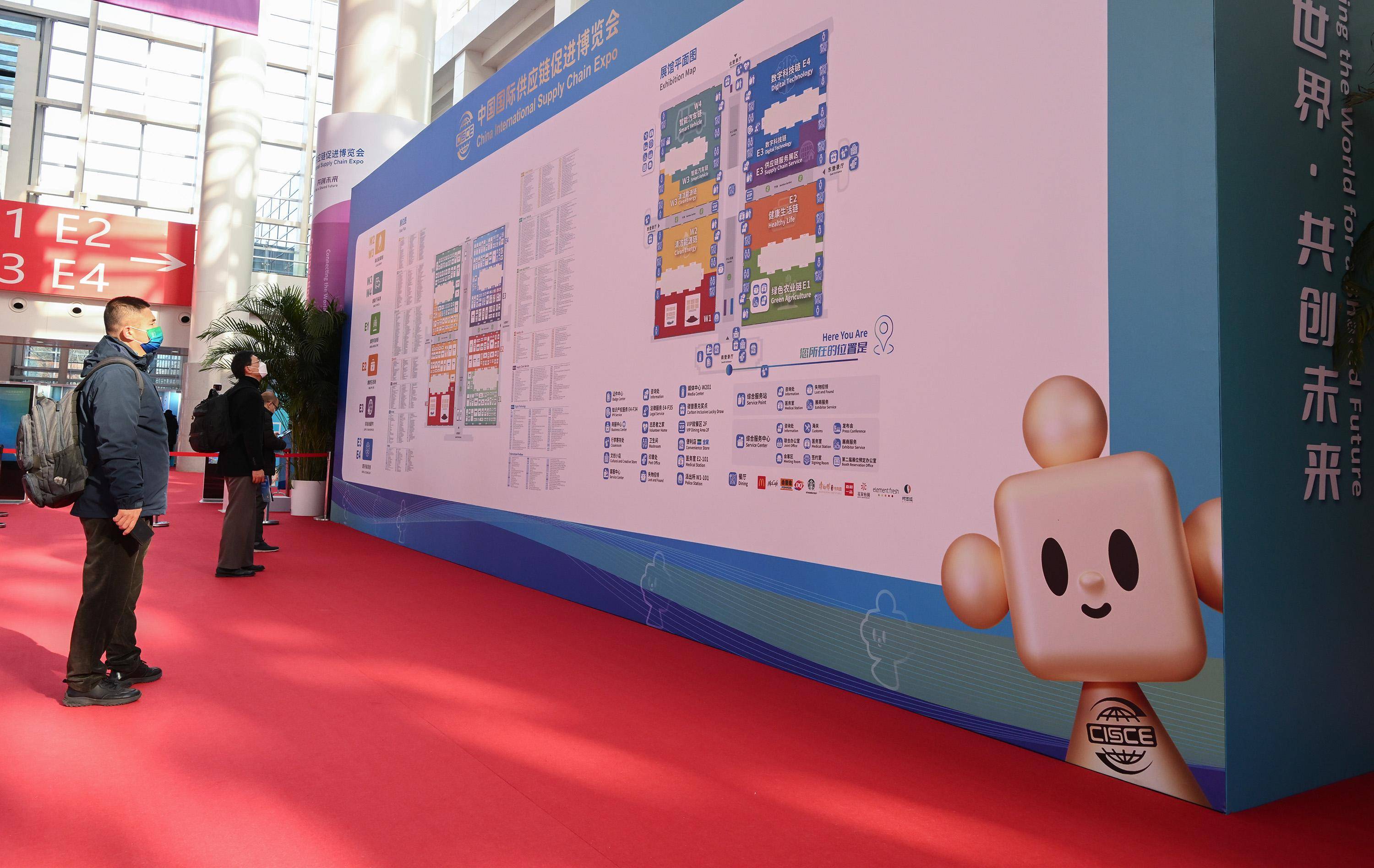 11月29日,链博会会场入口处的地图导引墙上印有吉祥物“链氪”的形象。 新华社记者 李贺 摄