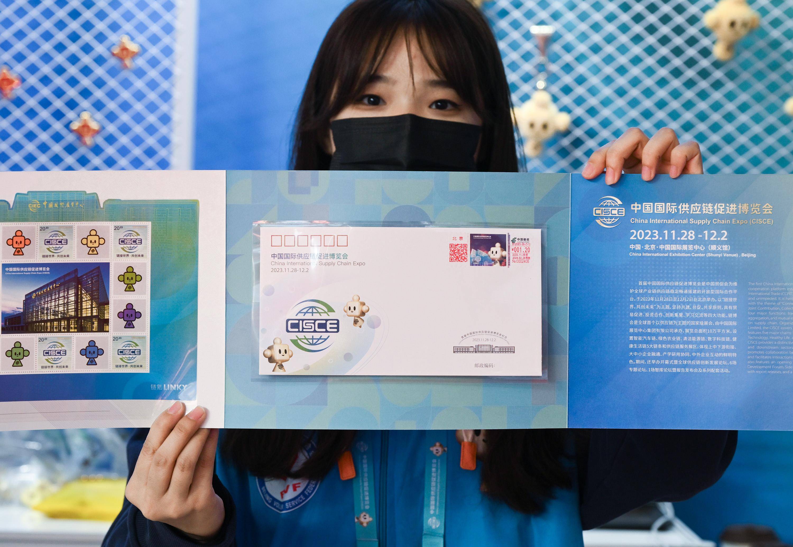 11月29日,一名在链博会文创小店服务的志愿者向记者展示带有“链氪”形象的链博会专属纪念邮折。 新华社记者 李贺 摄
