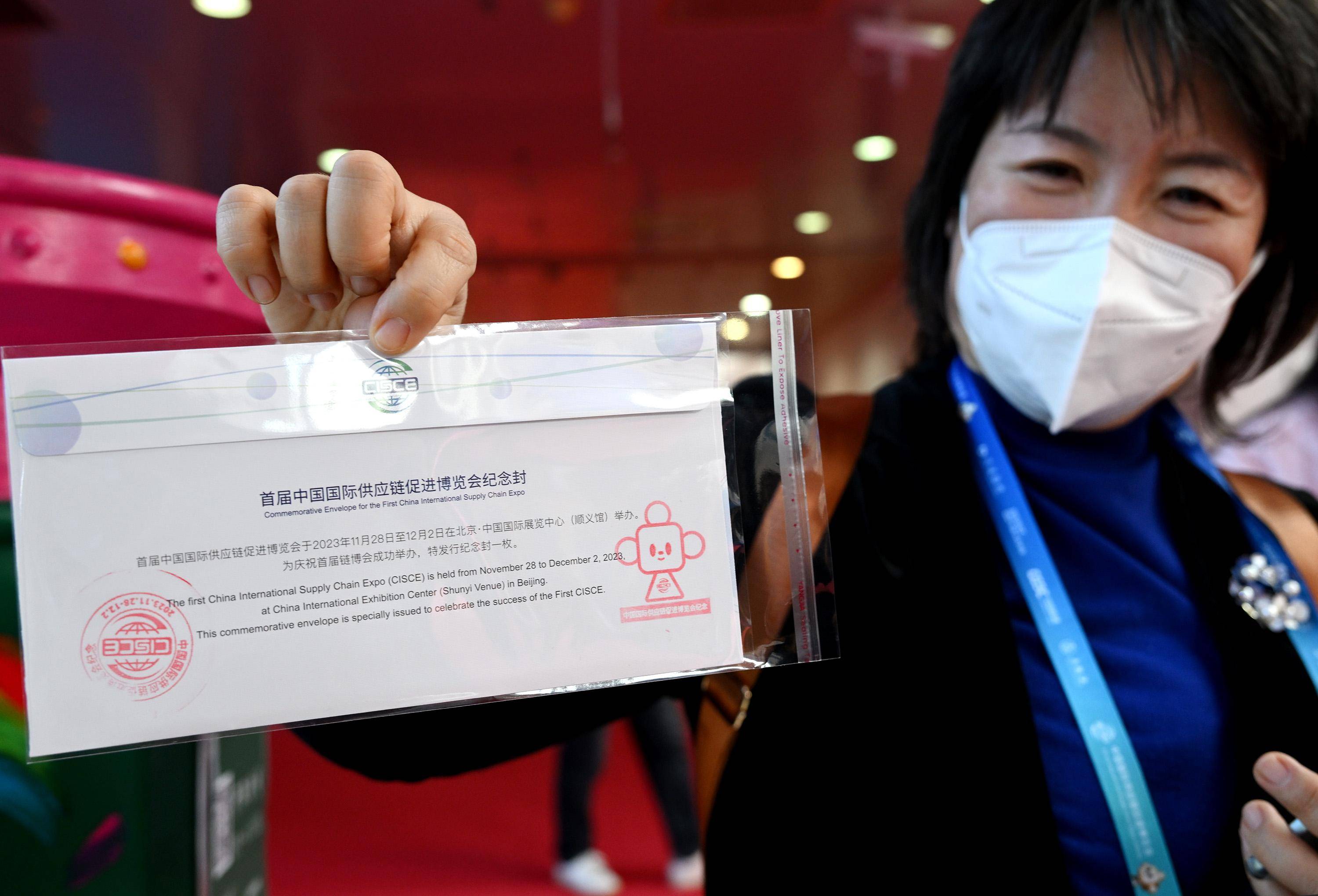 11月29日,一名观展者在自己购买的链博会纪念邮封上加盖了带有“链氪”形象的纪念邮戳。 新华社记者 李贺 摄