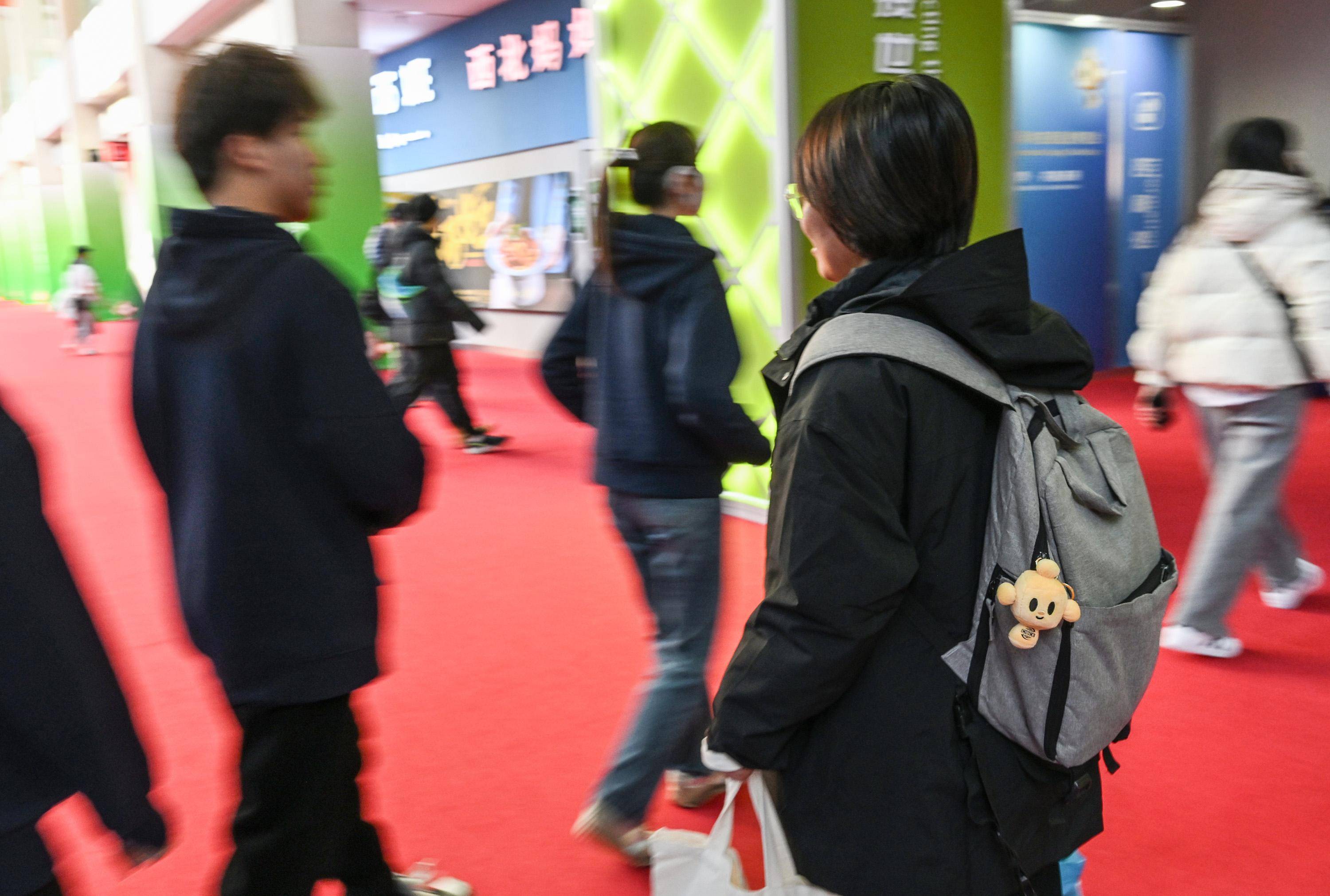 11月29日,一名观展者将挂链款的“链氪”毛绒玩具挂在自己的背包上。 新华社记者 李贺 摄