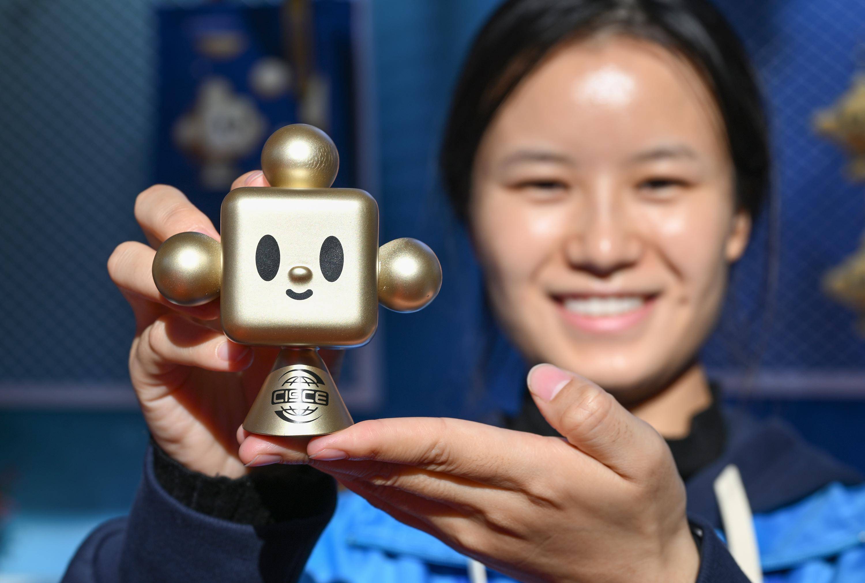 11月29日,在链博会文创小店服务的志愿者向记者展示 “链氪”玩具手办。 新华社记者 李贺 摄