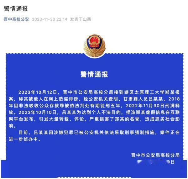 2023年10月12日,晋中市公安局高校分局接到辖区太原理工大学郑某报案,称其被他人在网上造谣诽谤。