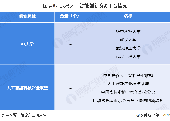 目前武汉拥有AI大学4所,分别为华中科技大学、武汉大学、武汉理工大学和武汉工程大学;有人工智能科技产业联盟4个,分别为中国光谷人工智能产业联盟、人工智能产业标准联盟、中国畜牧业协会智能畜牧分会和自动驾驶城市示范与产业协同创新联盟。