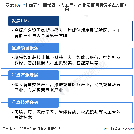 根据武汉市“十四五”规划,“十四五”期间,武汉市将聚焦智能芯片计算与系统、人工智能云服务、智能机器翻译、智能机器人、虚拟现实、智能家居等,高标准建设国家新一代人工智能创新发展试验区,人工智能产业进入全国第一方阵。