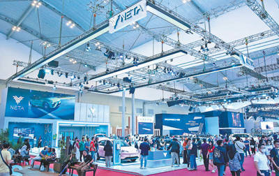 中国品牌哪吒汽车首次亮相2023年印尼国际汽车展。