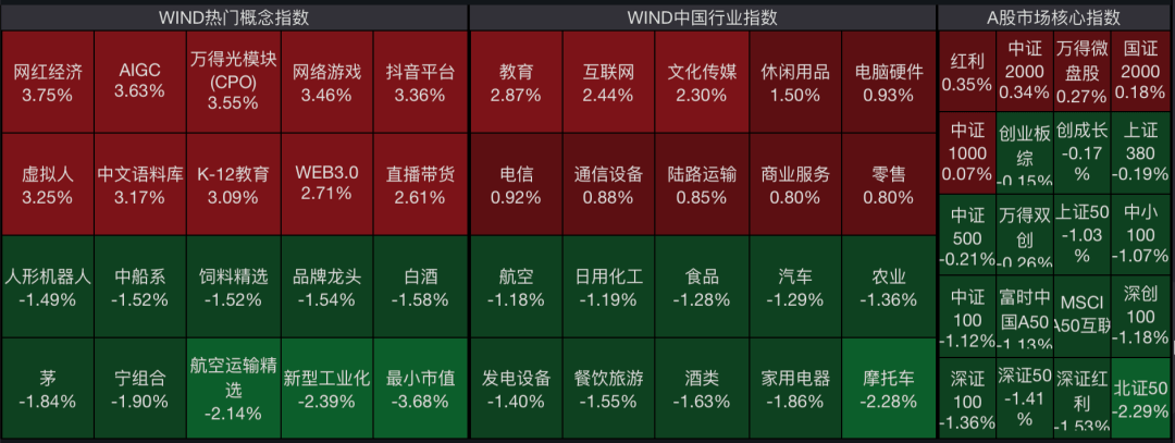 概念板块方面,短剧游戏、网红经济等概念领涨。猪肉等概念板块跌幅居前。