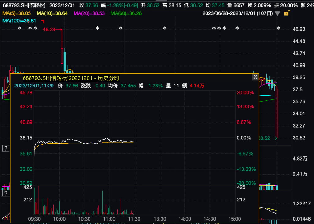 行情数据显示,在今天集合竞价阶段,倍轻松股票成交价为30.52元,触及“20cm”跌停,集合竞价成交额在6.1万元左右。
