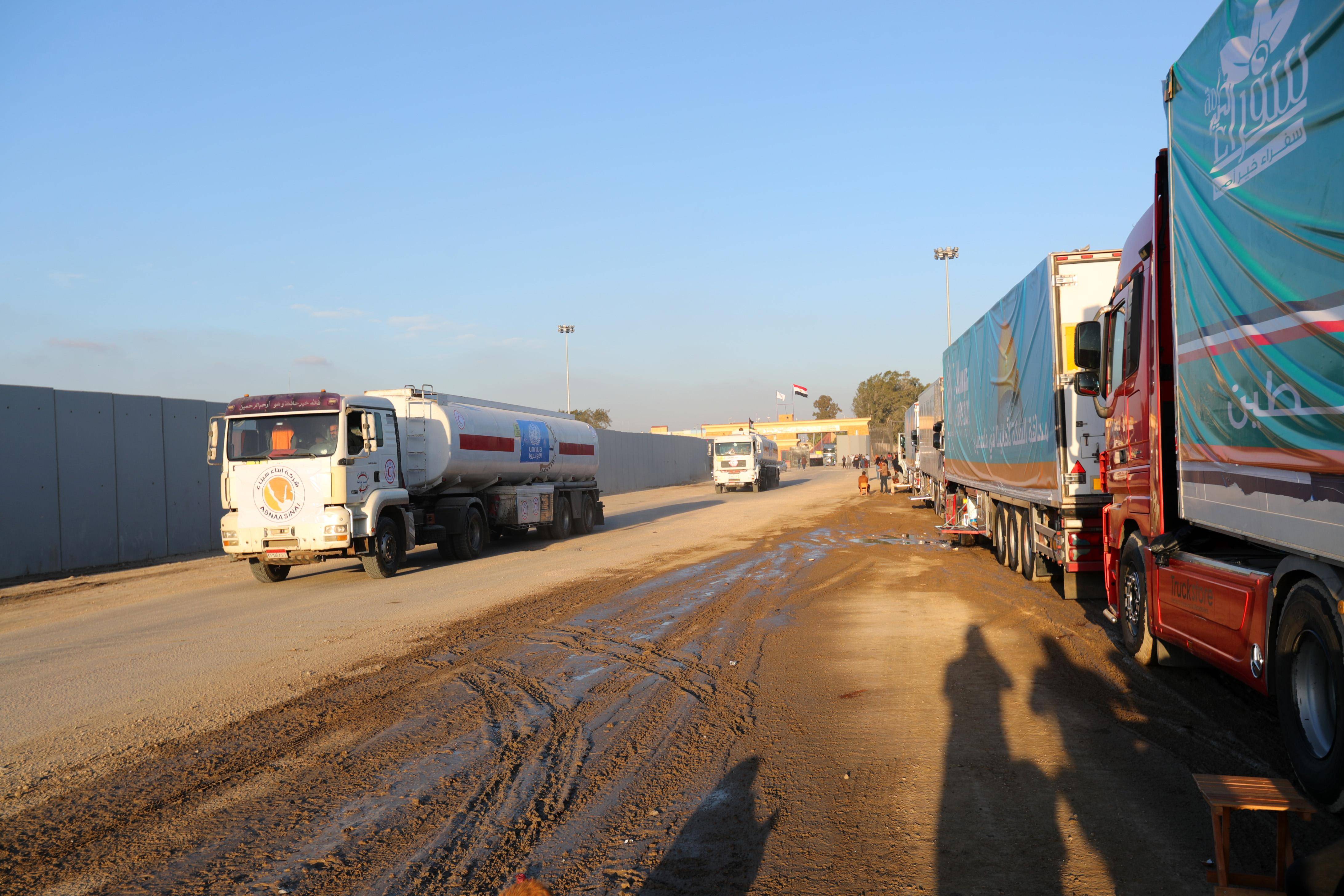 11月30日,完成燃料运送任务的卡车从加沙地带返回埃及。 新华社记者 隋先凯 摄