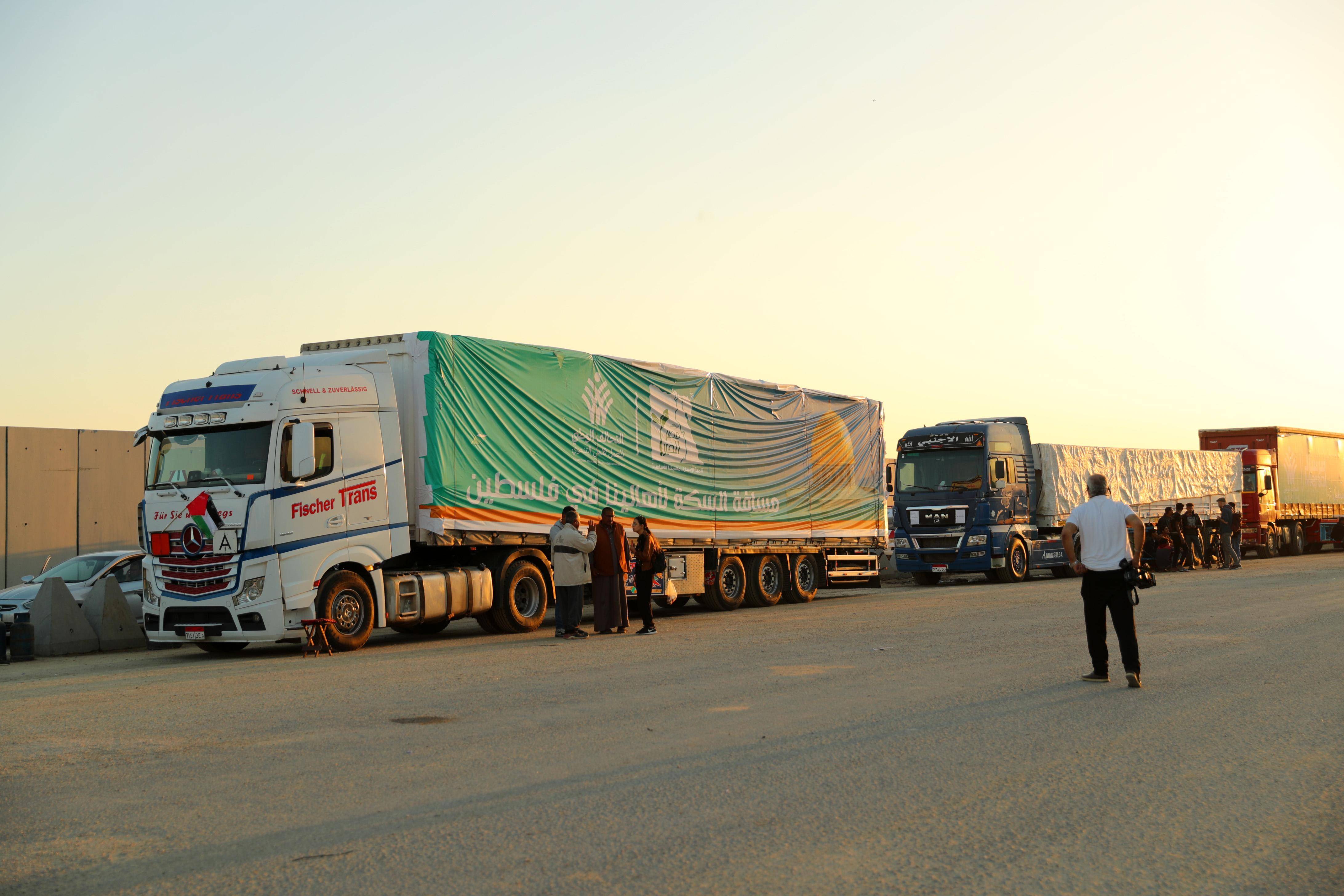11月30日,运送援助物资的卡车在拉法口岸埃及一侧排队等待进入加沙地带。 新华社记者 隋先凯 摄