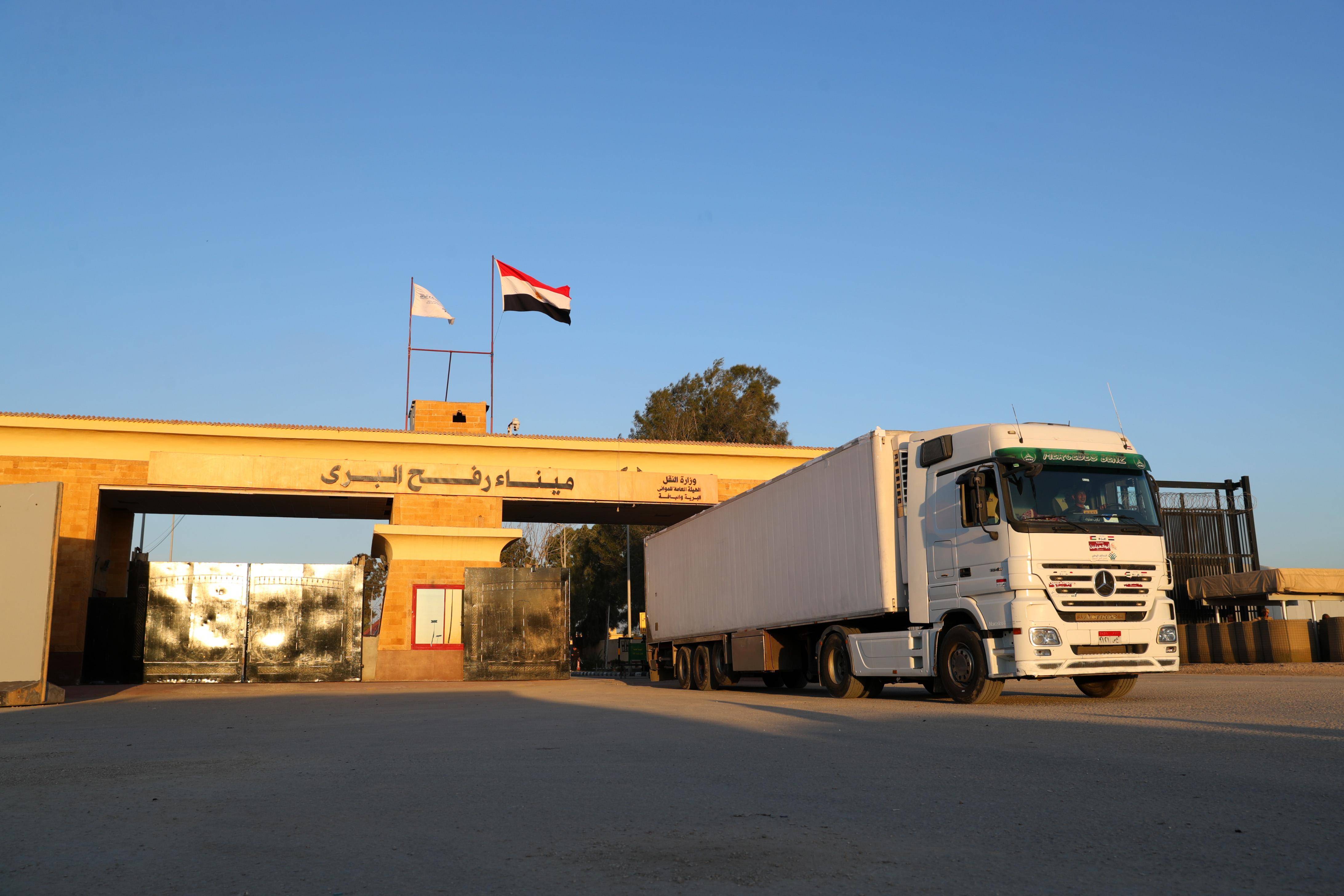 11月30日,完成援助物资运送任务的卡车从加沙地带返回埃及。 新华社记者 隋先凯 摄